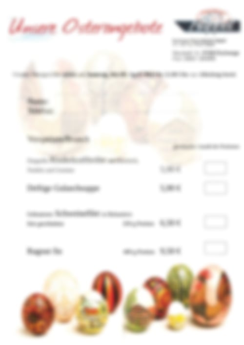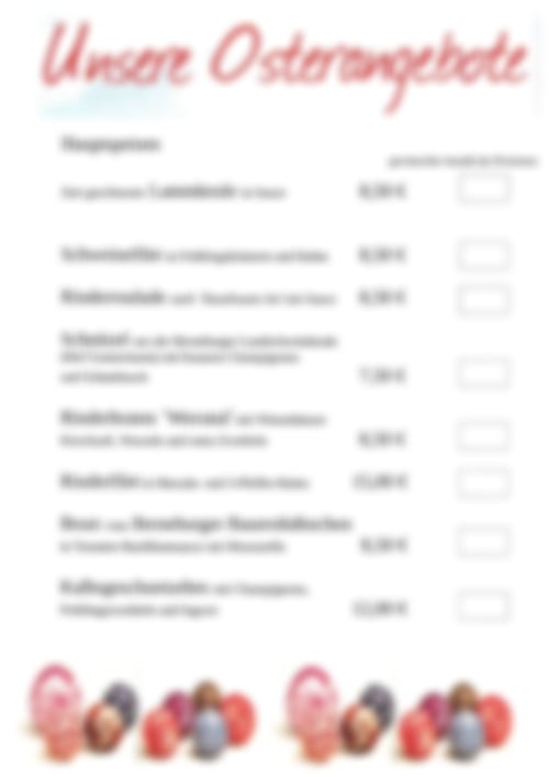 Hier finden Sie unsere Auswahl an fertig zubereiteten Ostergerichten, die Sie bestellen und am 03.04.2021 bis 12:00 Uhr abholen können.